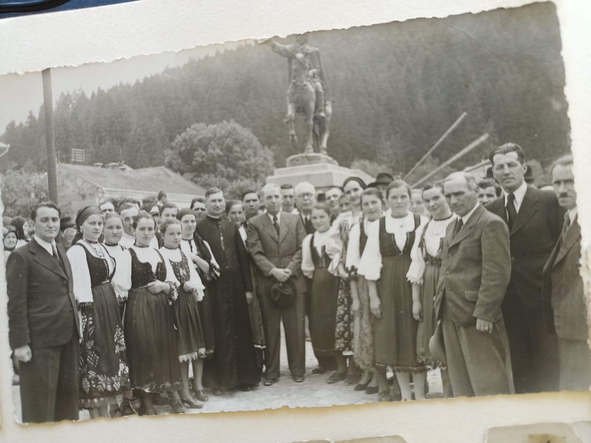 (1940, momentul când a fost adusă la Câmpeni statuia lui Avram Iancu; fotografia aparține familiei primarului din acel an, Victor Nicola, de meserie avocat (partea dreaptă, în costum negru), iar în fața sa, avocat, doctor în drept Motora, pretor în acea vreme; în partea stângă, secretarul orașului de la acea vreme).